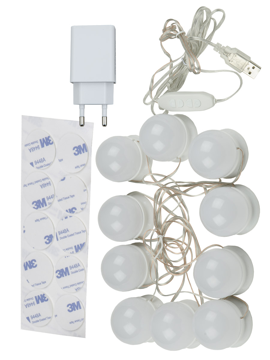 Светодиодный светильник предназначен для подсветки в условиях темноты или недостаточного освещения в режиме съемки фото и видео, для нанесения макияжа. Светильник имеет функцию регулировки яркости и цветовой температуры (теплый свет 3000К, белый свет 4000К, дневной свет 6500К). Для простоты установки на лампочках имеется двухсторонняя клейкая лента с помощью, которой лампочки можно установить на монтажную поверхность. Длина провода между лампами регулируется от 15 до 33 см. Лишний провод необходимо намотать на основание лампы. Лампочки лучше размещать равномерно по сторонам зеркал это позволит создать равномерную подсветку по периметру зеркала. Подключение светильника к сети происходит через переходник USB 5В 2А (в комплекте). Размер лампы 45*45*51 мм. Мощность светильника 8 Вт, мощность одной лампы 0,8 Вт. Степень защиты IP20.